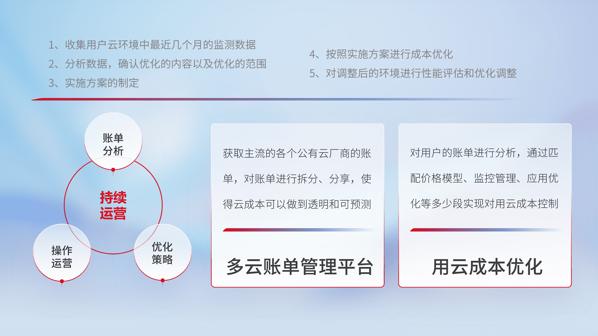 通过多云纳管,,,,以统一的资源数据模型把客户的云资源进行抽象和封装,,进而实现对多云资源的统一操作,,,保障云资源管理的可靠性、、、、稳定性与可用性。。量身定制化运维内容,,,,配置、、、开发运维、、补丁管理、、、备份、、、、监控、、、认证和访问管理、、审计和日常巡检等,,,保障在用云过程中的可靠度,,,,稳定度以及高可用率。。。