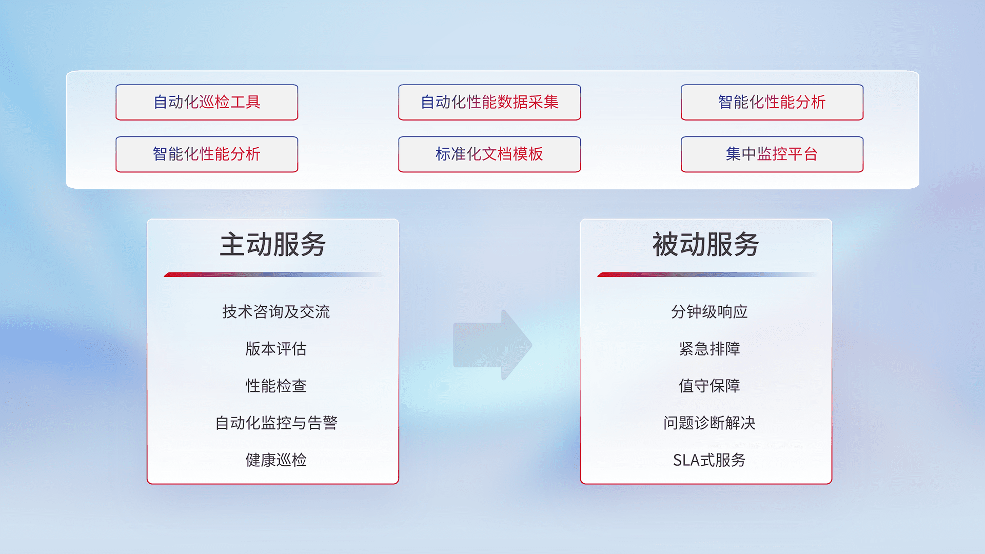 智能化工具和标准化文档,,,,保障服务质量,,,提供主动服务(包含技术咨询、、版本评估、、、、性能检查、、、、自动化监控与告警、、、健康巡检)和被动服务包含(分钟级响应、、紧急排障、、、、值守保障、、问题诊断解决、、、、SLA服务)。。。